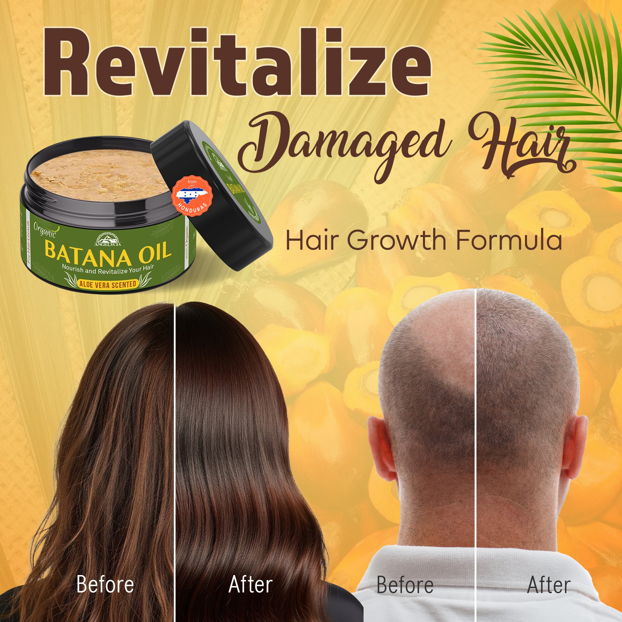 - REVITALIZE DAMAGED HAIR: Say goodbye to dry, damaged hair caused by UV rays, dyes, or heat styling. Angelycia Batana Oil deeply penetrates hair shafts with its unique hair mask formula, derived from the nut of the Palm tree. Restore shine, softness, and transform dry, brittle strands into a luscious mane.